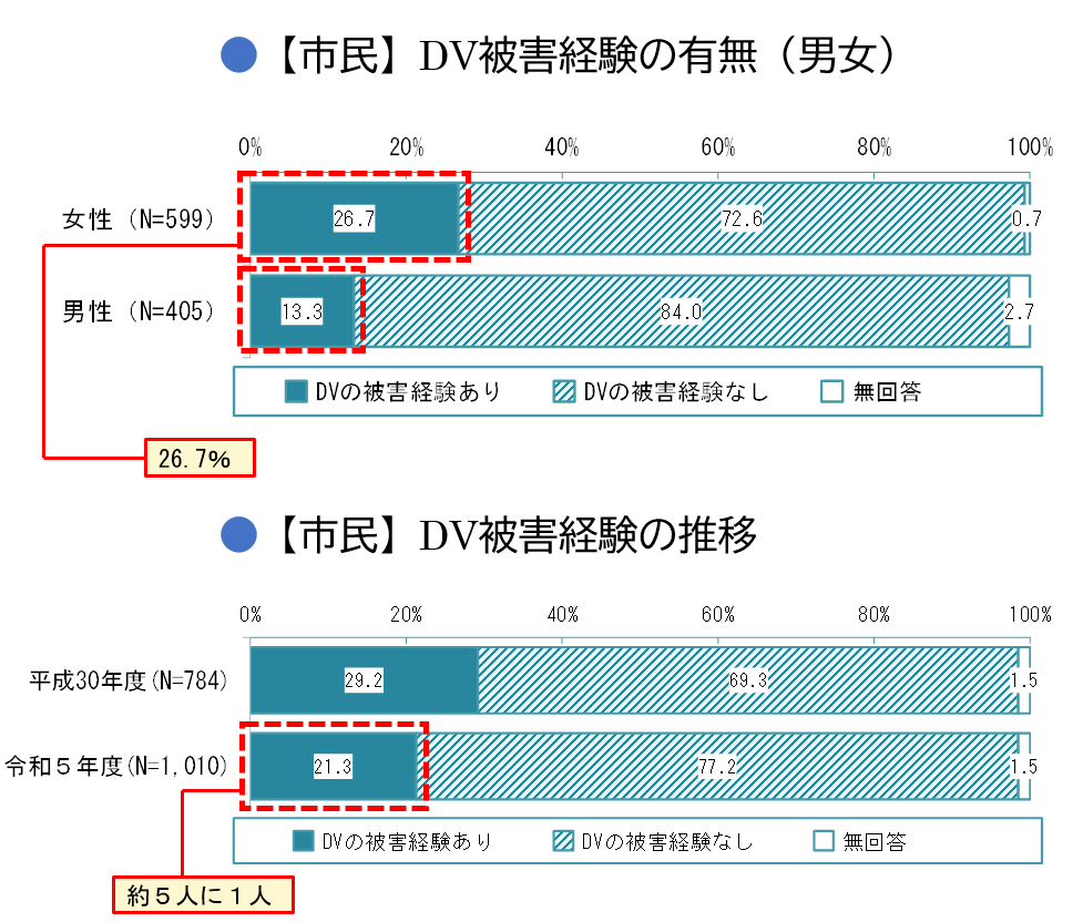 - 「DVは特別な人に起こることで、自分には関係ない」と感じる人もいるかもしれません。しかし、豊田市が令和5年度に行った調査結果では、DVの被害経験は女性が26.7%(全国は25.1%)で全国平均を上回っています。また、市民の約5人に1人は配偶者から身体的暴力を受けています